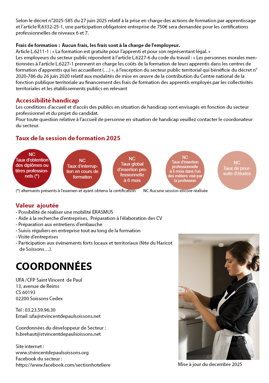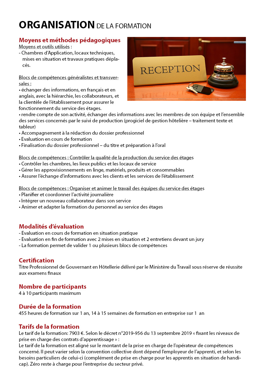 Calendrier 2026-2027 FICHE RNCP 39533 certificateur Ministère de l’Enseignement Supérieur et de la Recherche du 18/12/2024 Titre Professionnel Gouvernant en Hôtellerie Formation en Apprentissage
