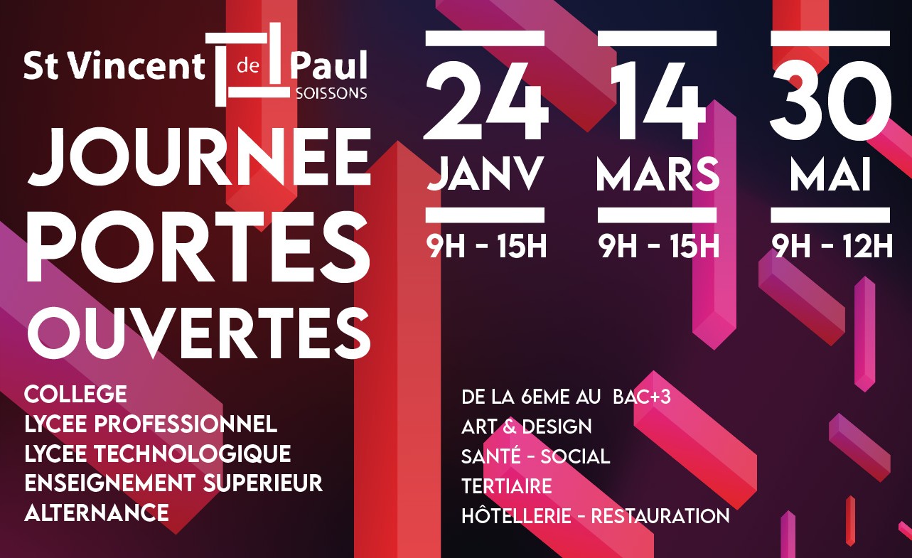 banniere 3date 2026encartBTSOLrectoMAJEntV comme Vincent CONTACTS PORTES OUVERTES JOURNEES DECOUVERTES INSCRIPTION COLLÈGE – LYCÉE SAINT VINCENT DE PAUL 13, avenue de Reims CS 60193 02207 Soissons CedexÉtablissement sous contrat avec l’État BIENVENUE DANS L’ÉCOLE DE TOUTES LES INTELLIGENCES Labellisé Lycée des Métiers du Design, de la Santé et de l’Hôtellerie